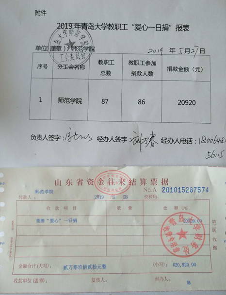 根据校工会在全校教职工中开展2019年“爱心一日捐”活动的通知精神,学院领导高度重视,在学院党委的领导下,学院工会以“为家庭经济困难师生纾困解难”为主题,积极对捐赠活动进行宣传,制定具体实施方案,依靠各工会小组,积极对捐赠活动进行宣传,倡导崇德向善社会文化,引导大家积极主动奉献爱心。活动中,全院86位教职工自愿参与,奉献爱心,共捐款20920元。
